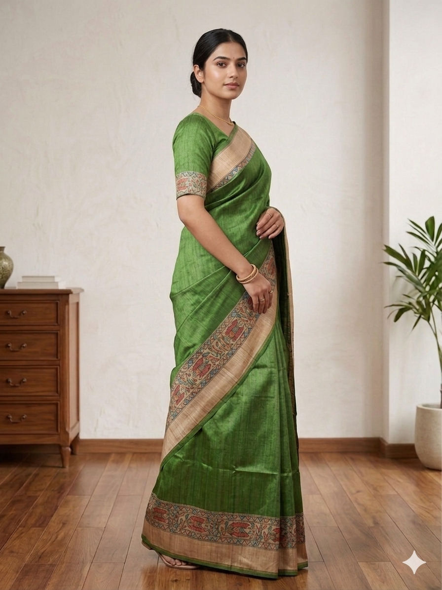 Green Bhagalpuri Pure Tussar Silk Saree with Madhubani Handpainting