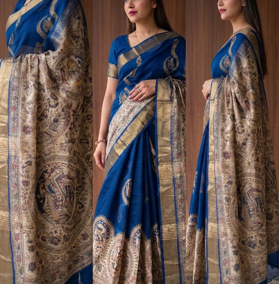 Blue Chanderi cotton silk sarees with Madhubani print